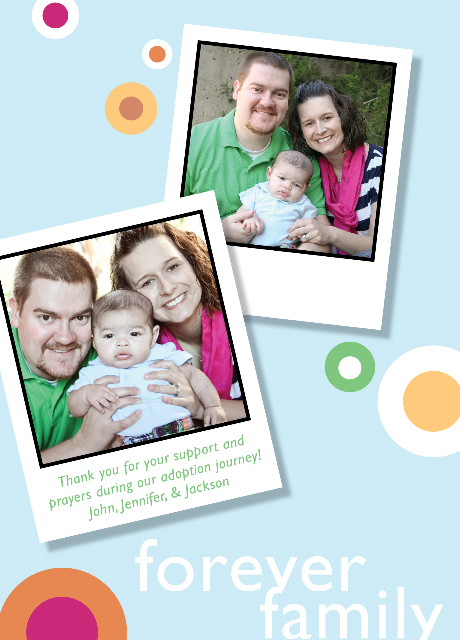 We finally got to send out our adoption announcement! Yay! Thanks to a great friend for designing it and for a great photographer for taking the photos. I think they turned out pretty darn cute!